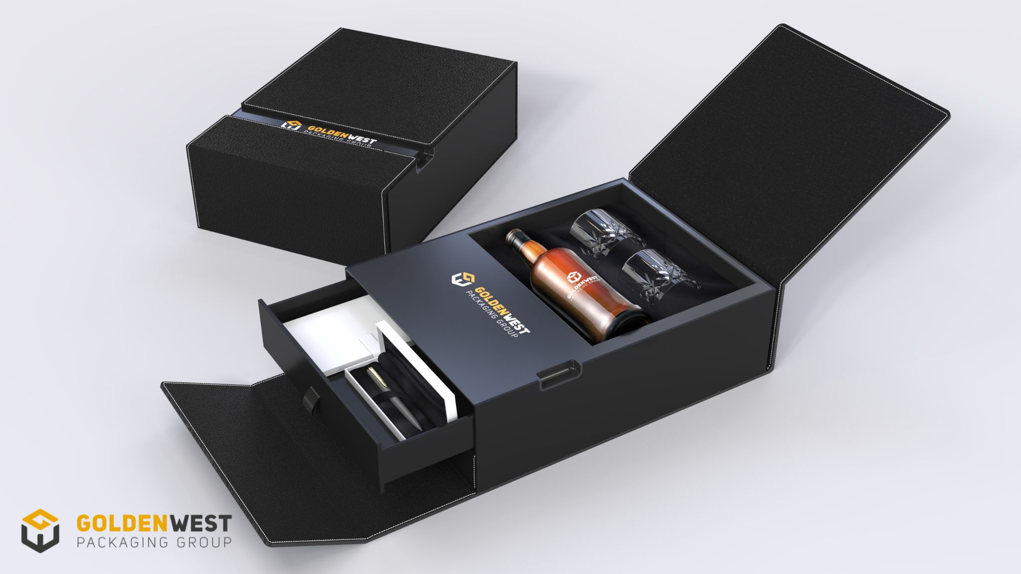 When space is at a premium, Golden West can manufacture rigid boxes that ship flat but then can be easily assembled on site. This option offers the same luxury feel as a traditional set up box but requires a fraction of the space to store inventory. Great for tasting rooms and high-end luxury good retail locations with limited storage.